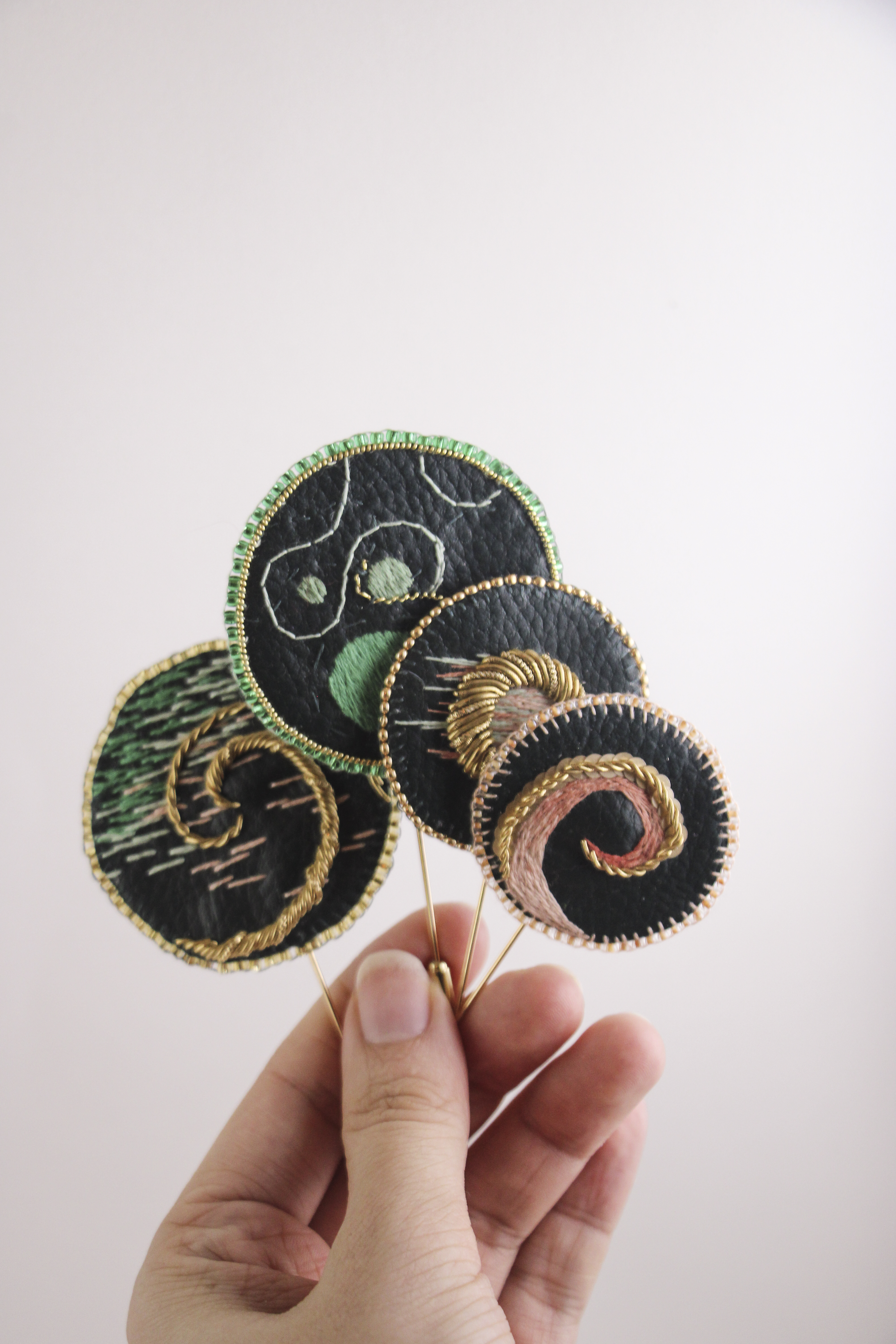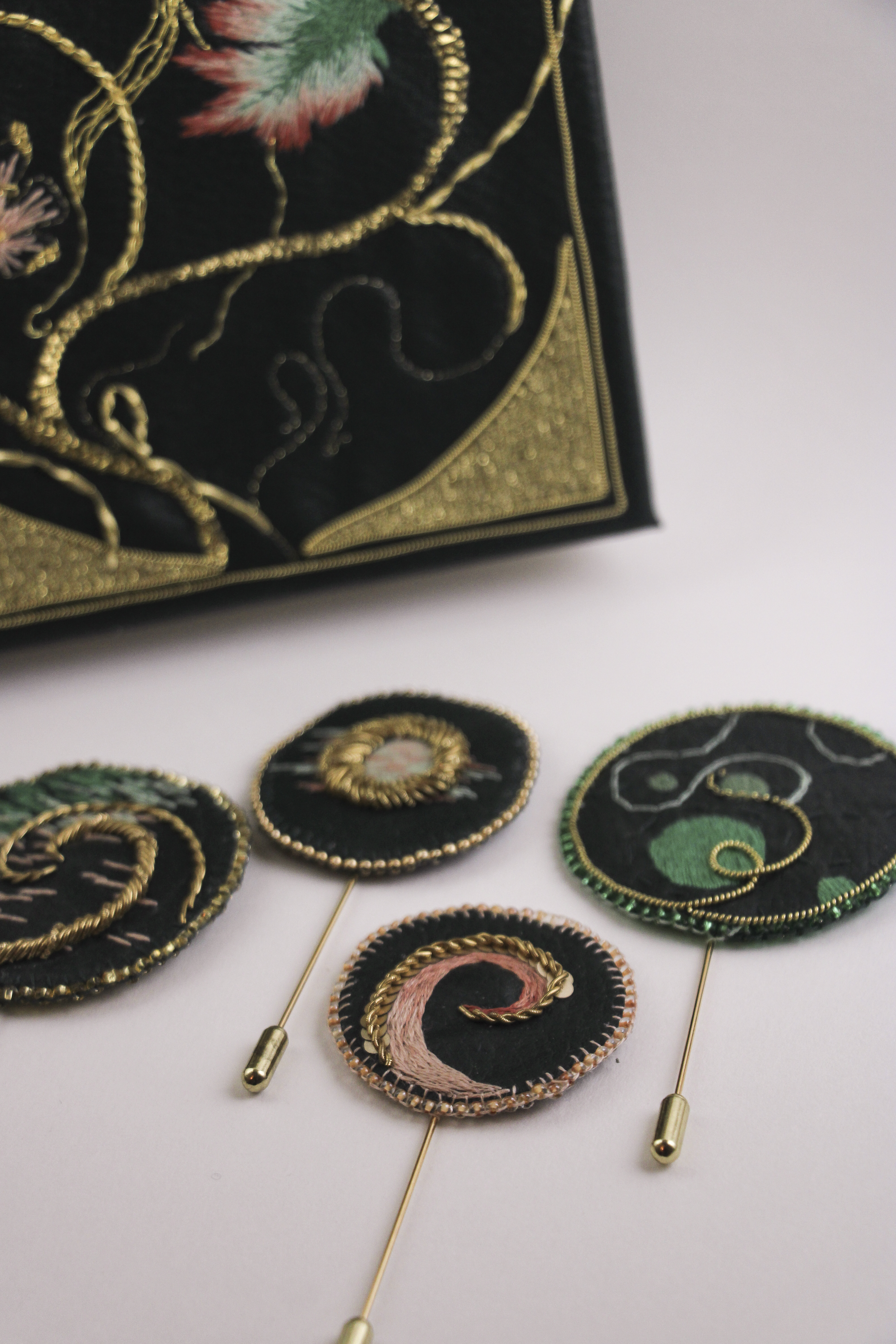 Pour mon CAP Broderie Main j’ai réalisé une pièce d’exception : un livre brodé inspiré de l’art nouveau. J’ai souhaité valoriser les fils et autres fournitures qu’il me restait dans une collection capsule de quatre broches.