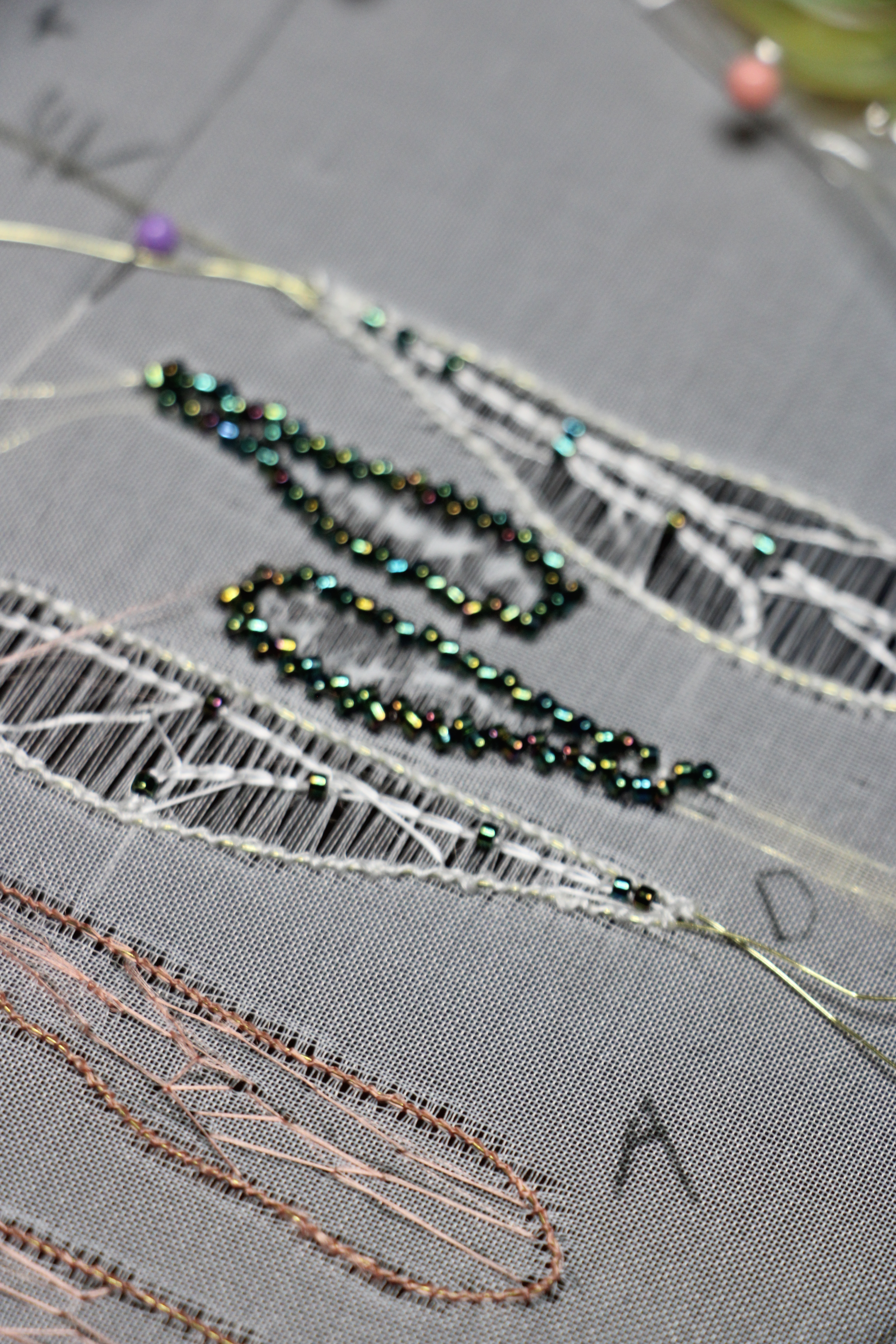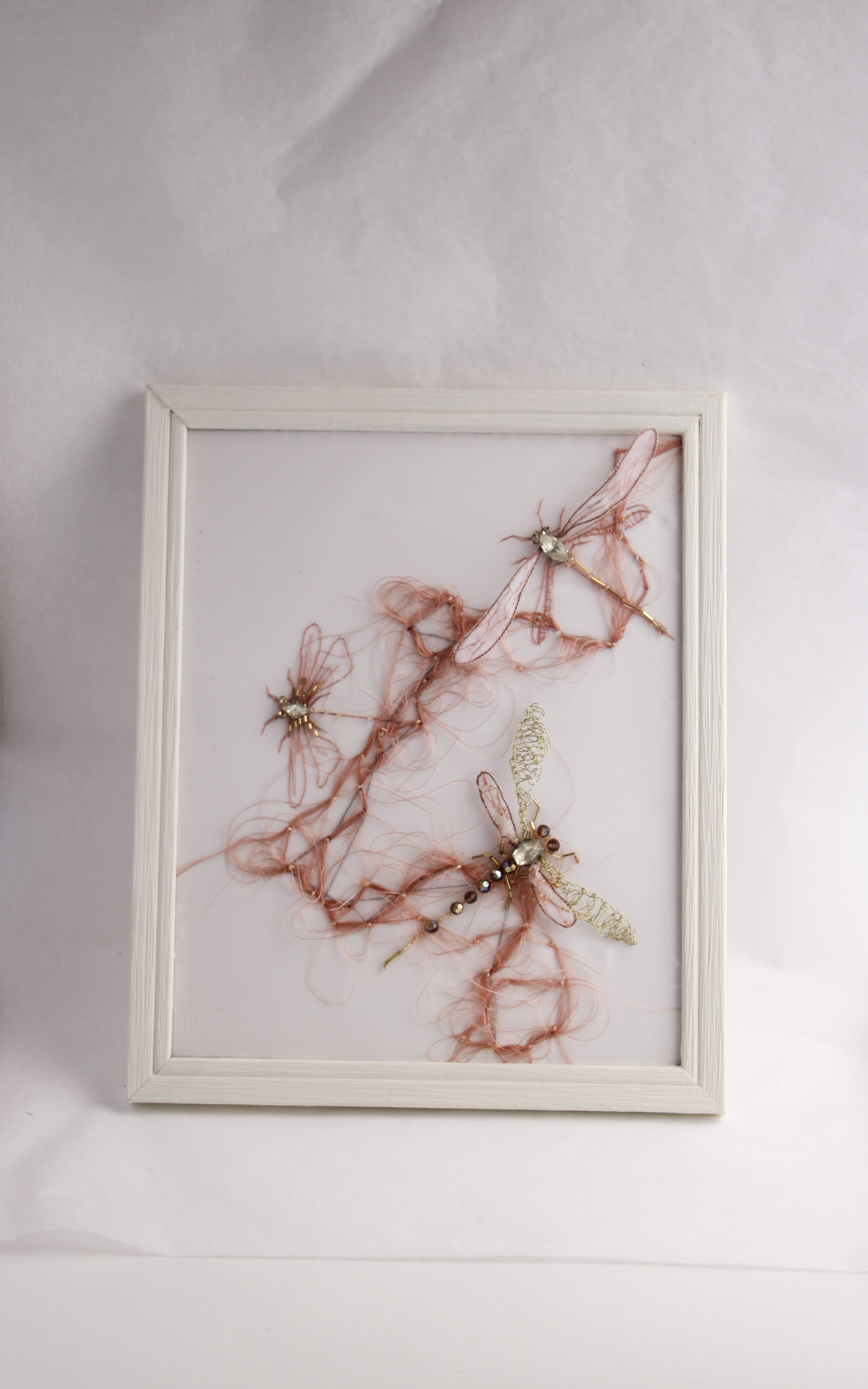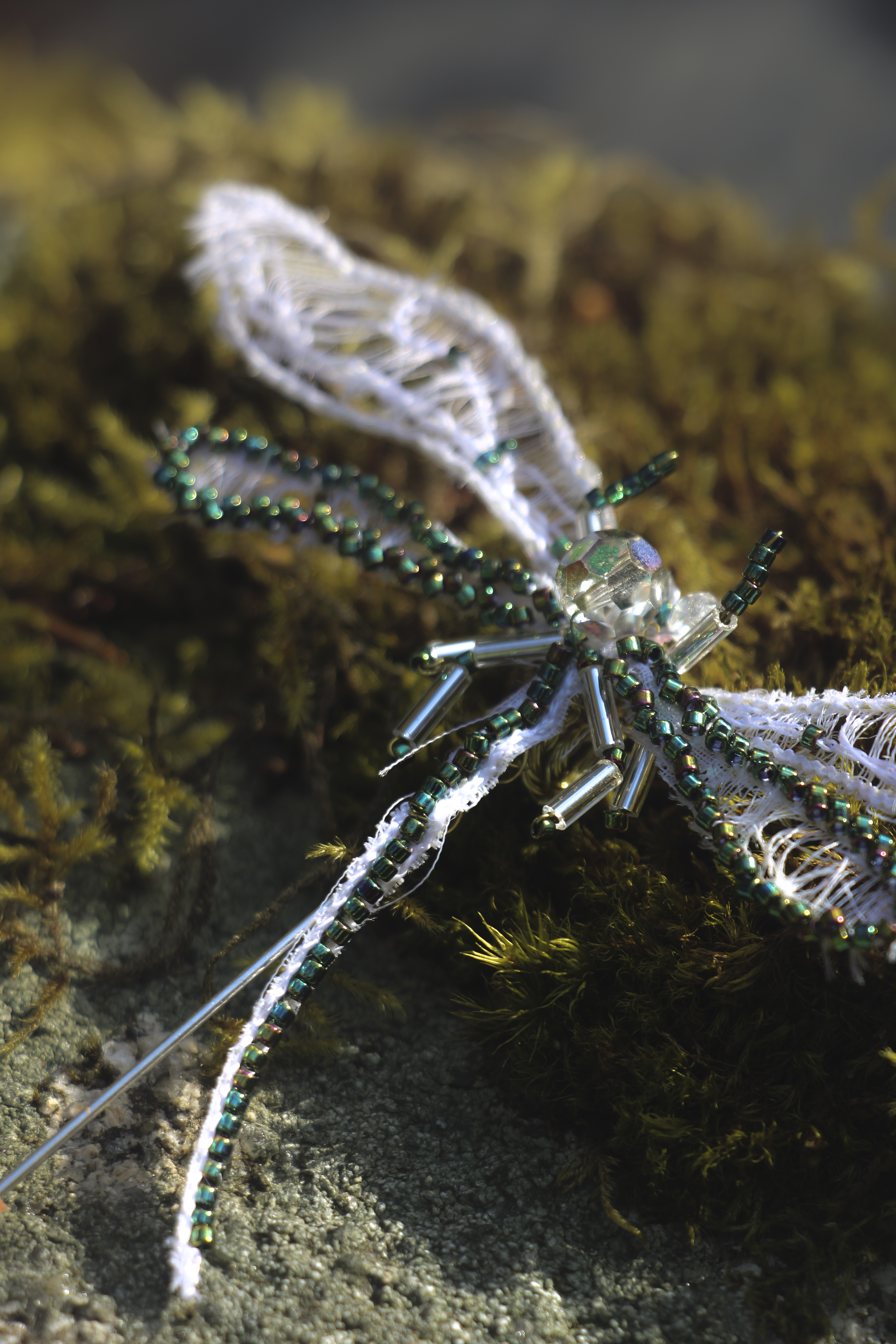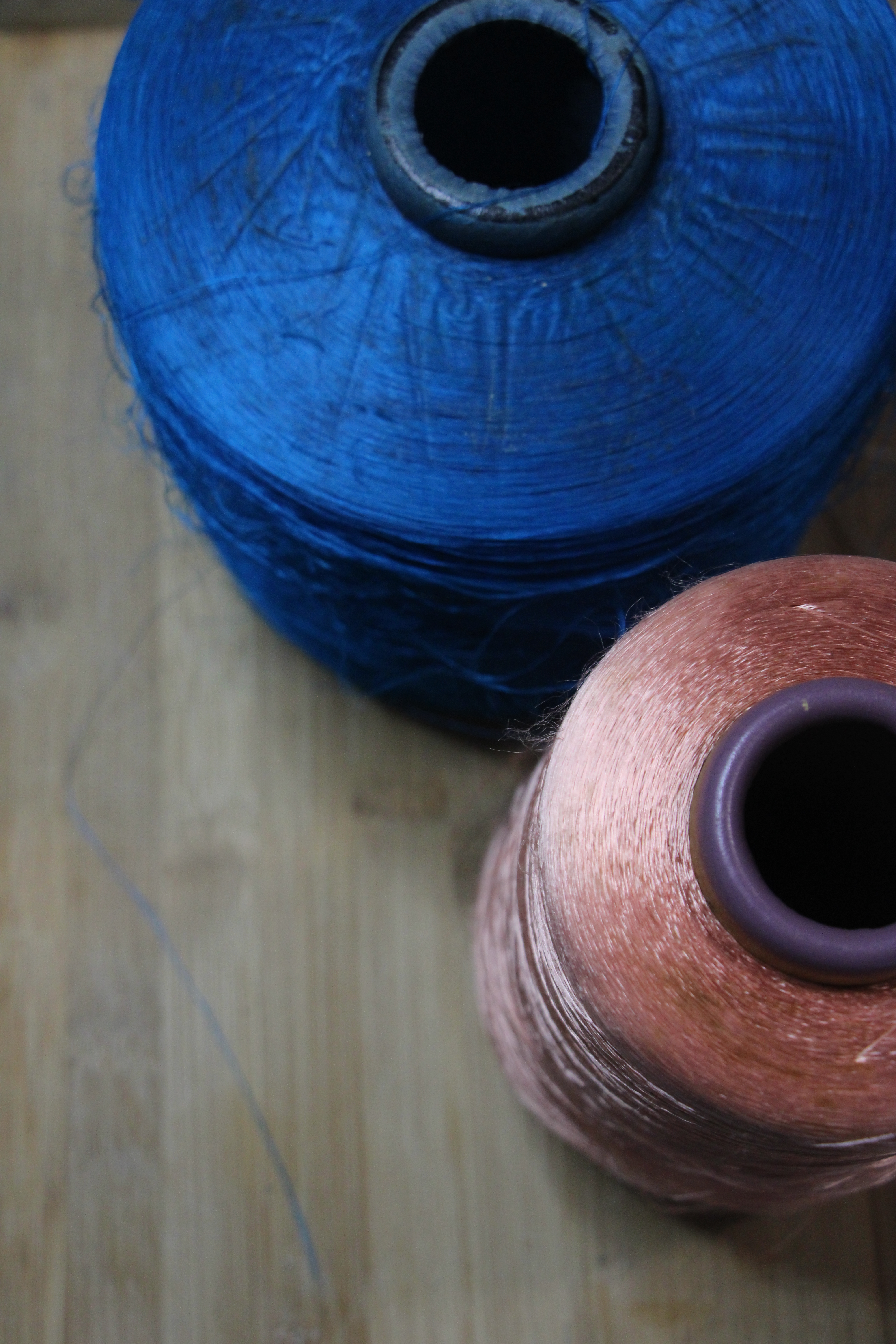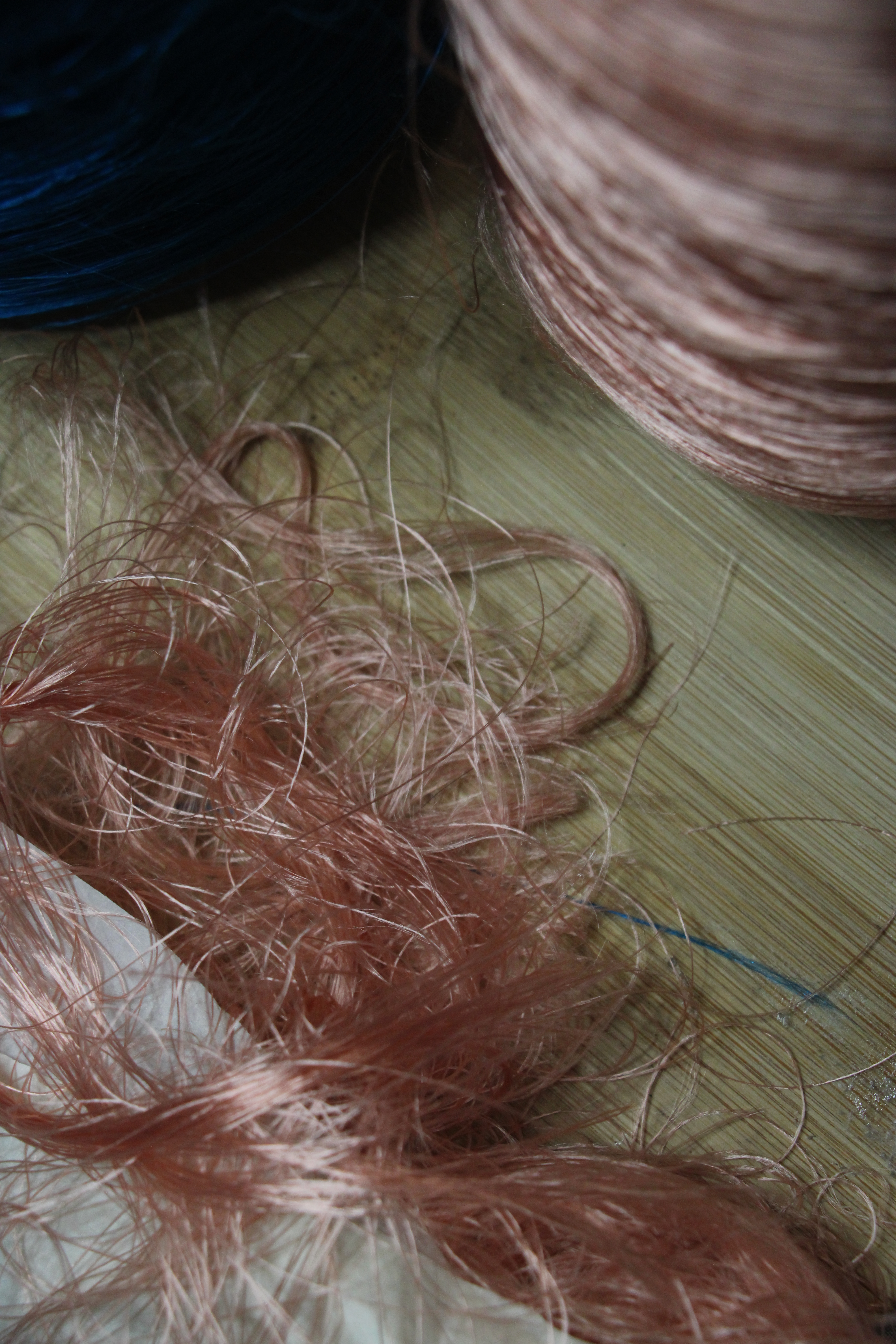 Le printemps est arrivé à l’atelier ! J’ai déniché au fin fond d’une ressourcerie creusoise de magnifique cône de rayonne. Elle était toute deux en très bonne état mais les premiers mètres de fils s’emmêlaient dans un joyeux fouillis autour de leur bobines. Après quelques coups de ciseaux les chutes de fil s’entrelacent avec légèreté et dévoilent par endroit les premières libellules de la saison.